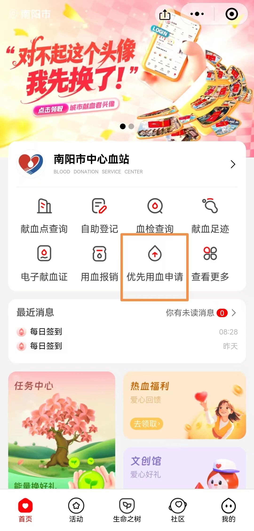 为进一步落实我市无偿献血者优先用血的相关政策,保障无偿献血者权益,提升广大无偿献血者的荣誉感和获得感,全面兑现献血者本人及家庭成员应享有的优待福利,南阳市中心血站推出无偿献血者优先用血线上办理业务。现将有关事项告知如下: