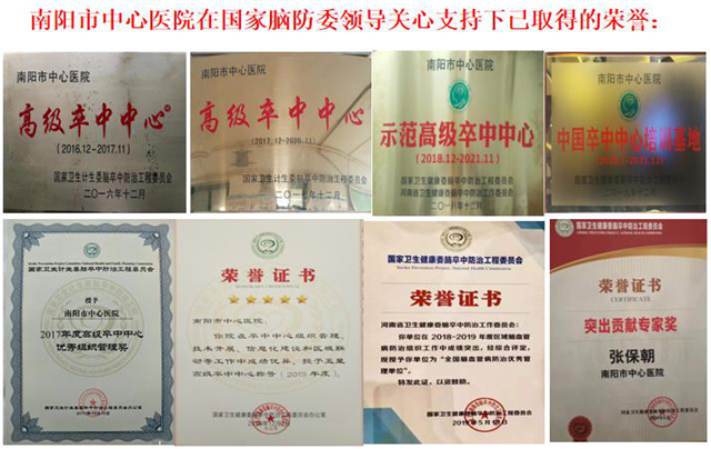 南阳市中心医院分别于2018年5月、7月,2019年7月、8月、9月、10月,2020年5月共7次获得了取栓技术排名全国第一、脑血管病诊疗技术综合排名全国第六的优异成绩,既造福了一方百姓,也奠定了南阳市在全省乃至全国该领域的学术领先地位。南阳市中心医院也因在脑卒中防治工作中的优异表现,先后获选国家卫健委脑防办“国家示范高级卒中中心”,2018年与2019年连续两年“国家五星高级卒中中心”,2019年12月获选成为河南省地市级医院唯一一家“中国卒中中心培训基地”(全国仅26家,地市级医院仅6家,河南省仅3家),承担起为全国各级各类医院普及传授脑卒中标志性适宜技术和培训脑卒中防控人才的光荣而艰巨的任务。